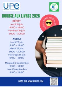 Les livres invendus peuvent être récupérés par les familles dépositaires qui en font la demande par mail à l’adresse : upe@lyceefrancais.be avant le 18 décembre 2026. Les livres invendus seront alors mis à votre disposition au local de l’UPE aux heures de permanence du bureau de l’UPE. Nous vous restituerons un livre de même référence que celui que vous avez déposé, mais pas nécessairement votre livre.
